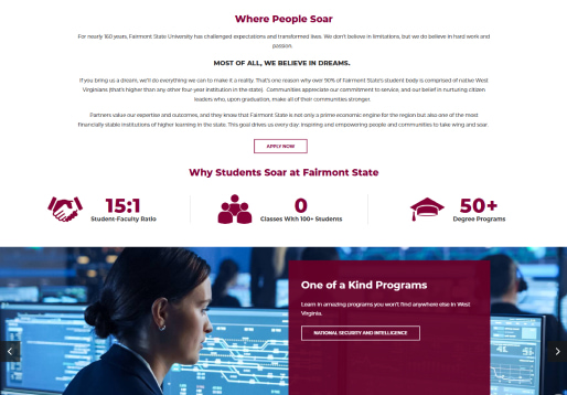 For nearly 160 years, Fairmont State University has been leading students on the path towards a brighter future with more than 50 degree programs and a wealth of campus resources to help them achieve their goals. However, their previous site fell short in organization and search functionality, making it challenging for prospective students to find what they needed. To address these crucial stakeholder concerns and meet the expectations of both current and prospective students, Beacon stepped in to pitch a fresh, performance-driven website that welcomed students to easily explore all that Fairmont has to offer.