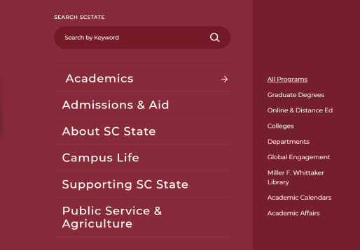 A streamlined navigation highlighting academic programs and a site search function provides students and prospective students at South Carolina State University the ability to quickly and easily locate the information they need.