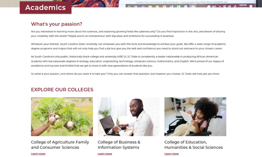 Created a modern design with captivating visuals, incorporating brand colors, a social media feed, and easy program pathways that students can utilize to learn more about the South Carolina State University experience and offerings.